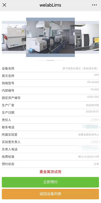 点击所需设备的预约按钮进入设备详细信息页面,详细介绍该设备预约费用,设备信息等,具体如下所示: